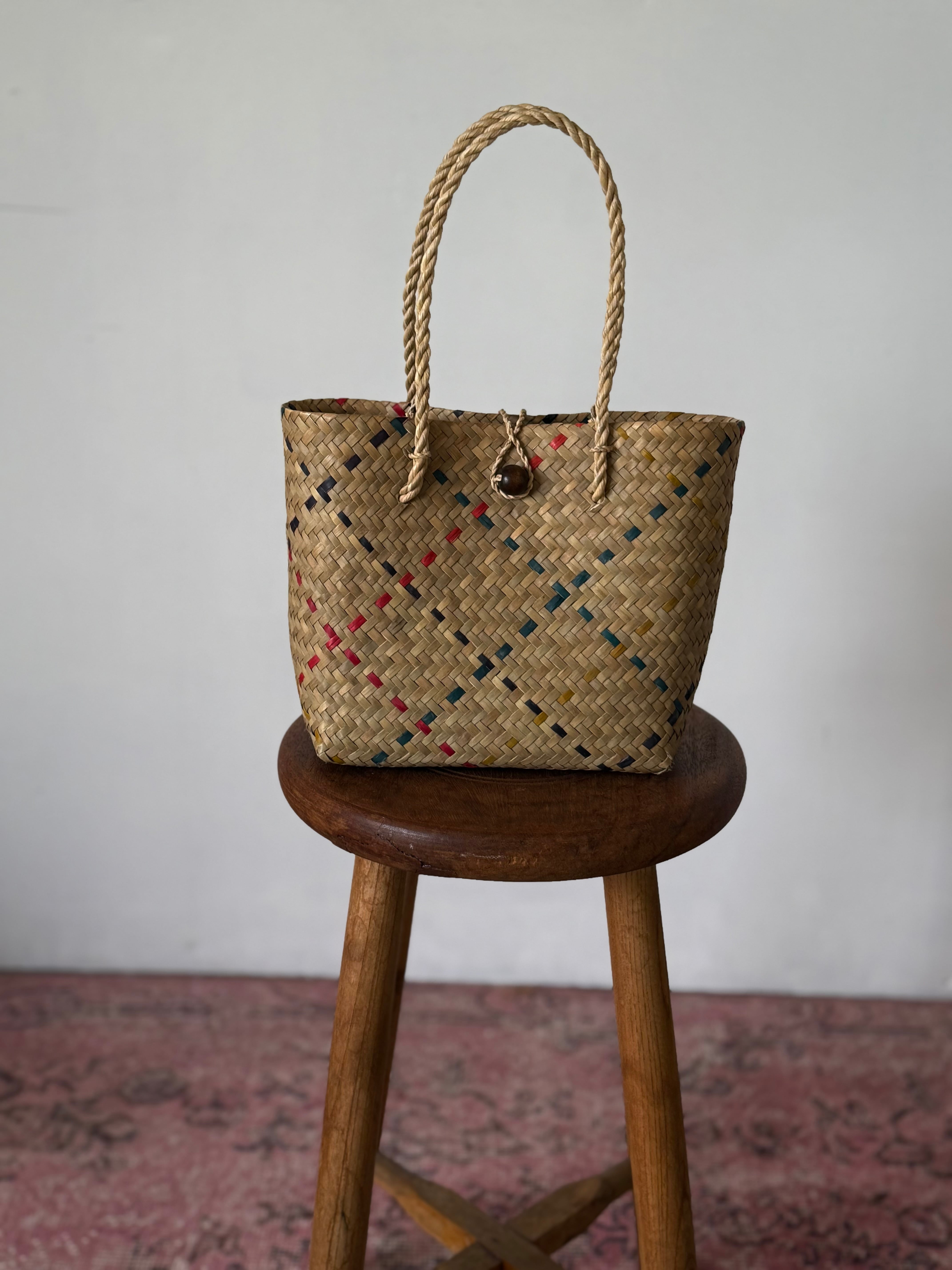 (編み目を押すとパリッとした感触)のボタン付きミニトートバッグ。