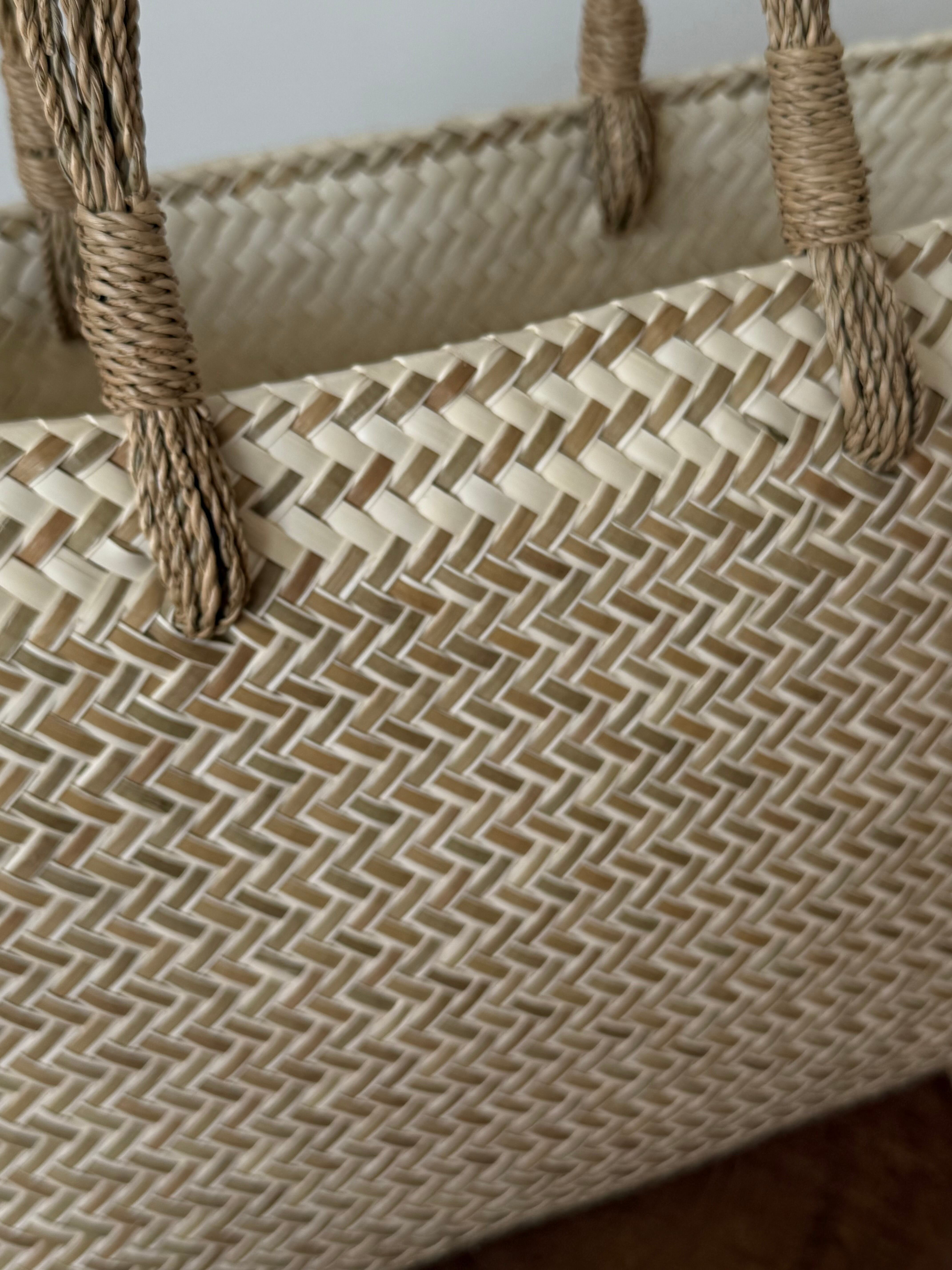 ホワイトに染めた水草の上からナチュラルな水草を重ねて編む、