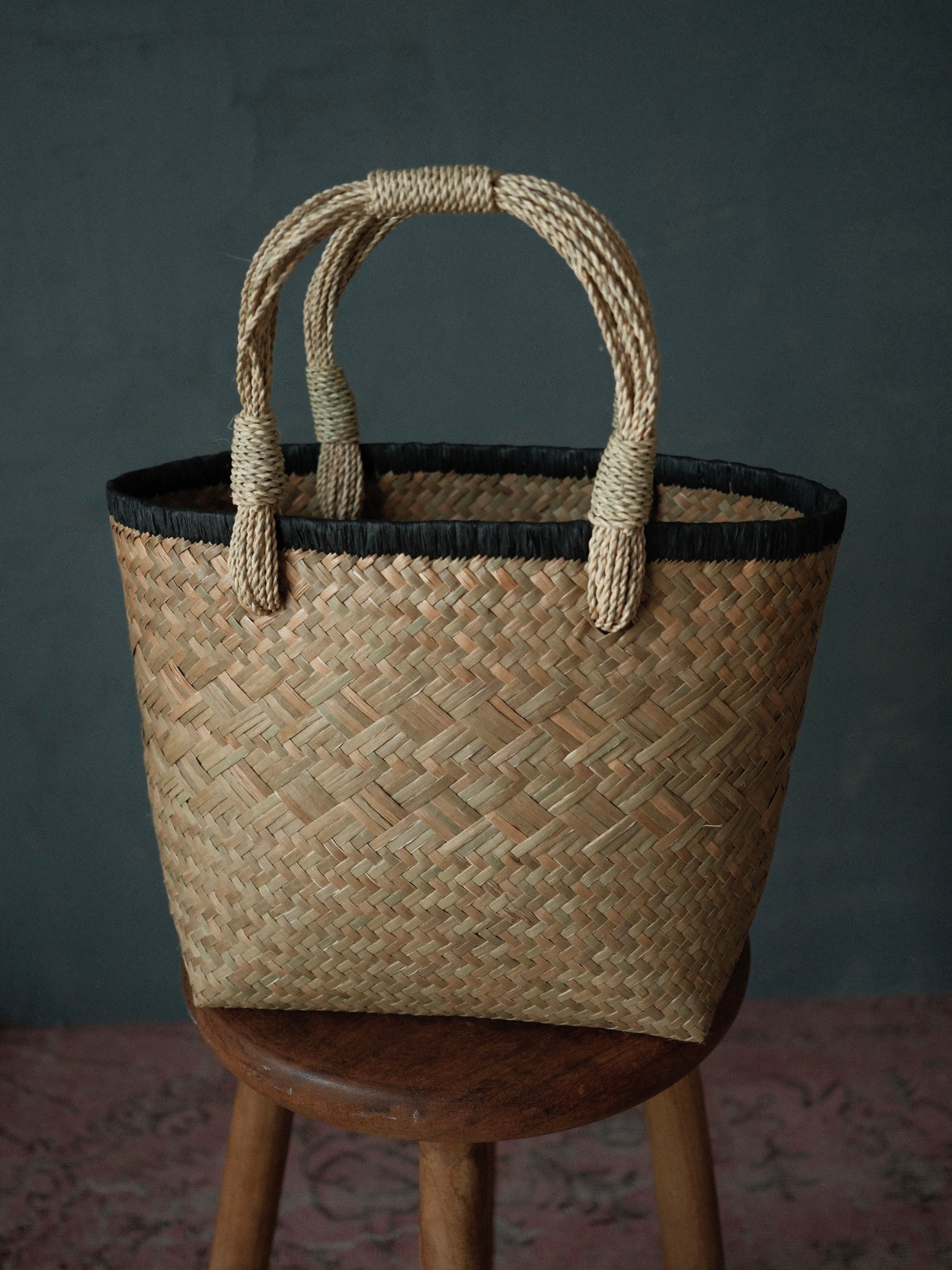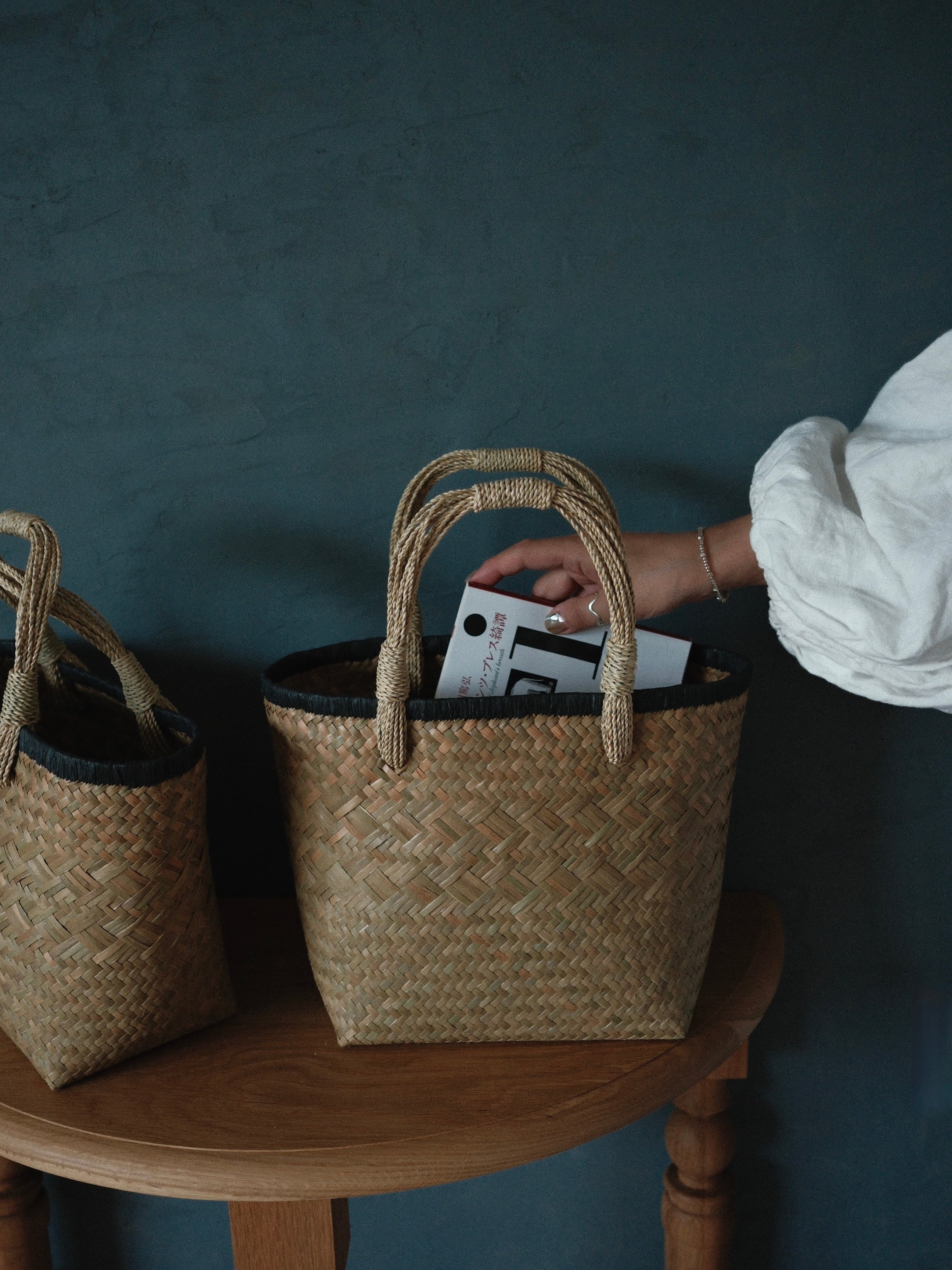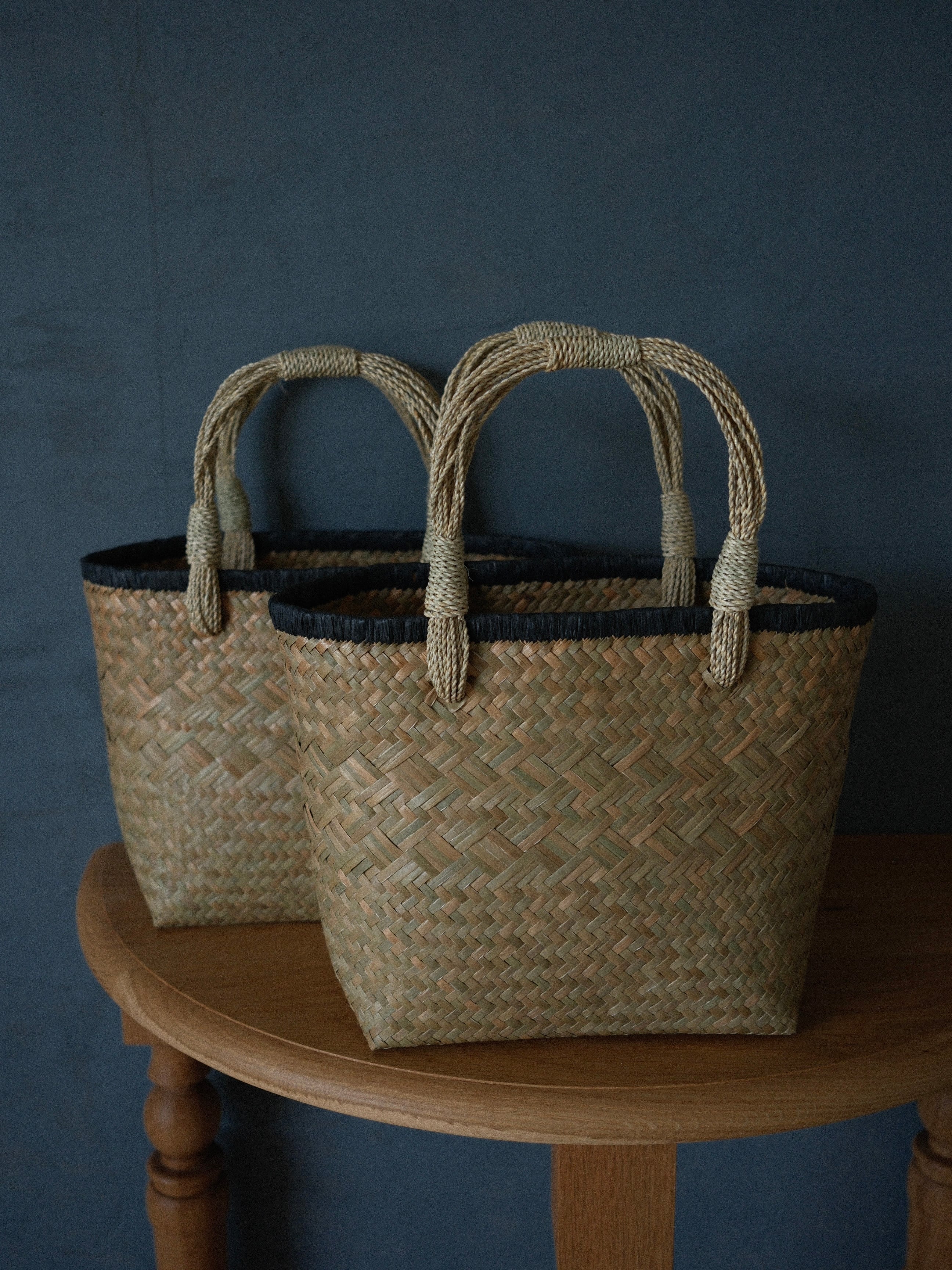 墨色(灰色ががった黒)で縁取りされた水草トートバッグ。